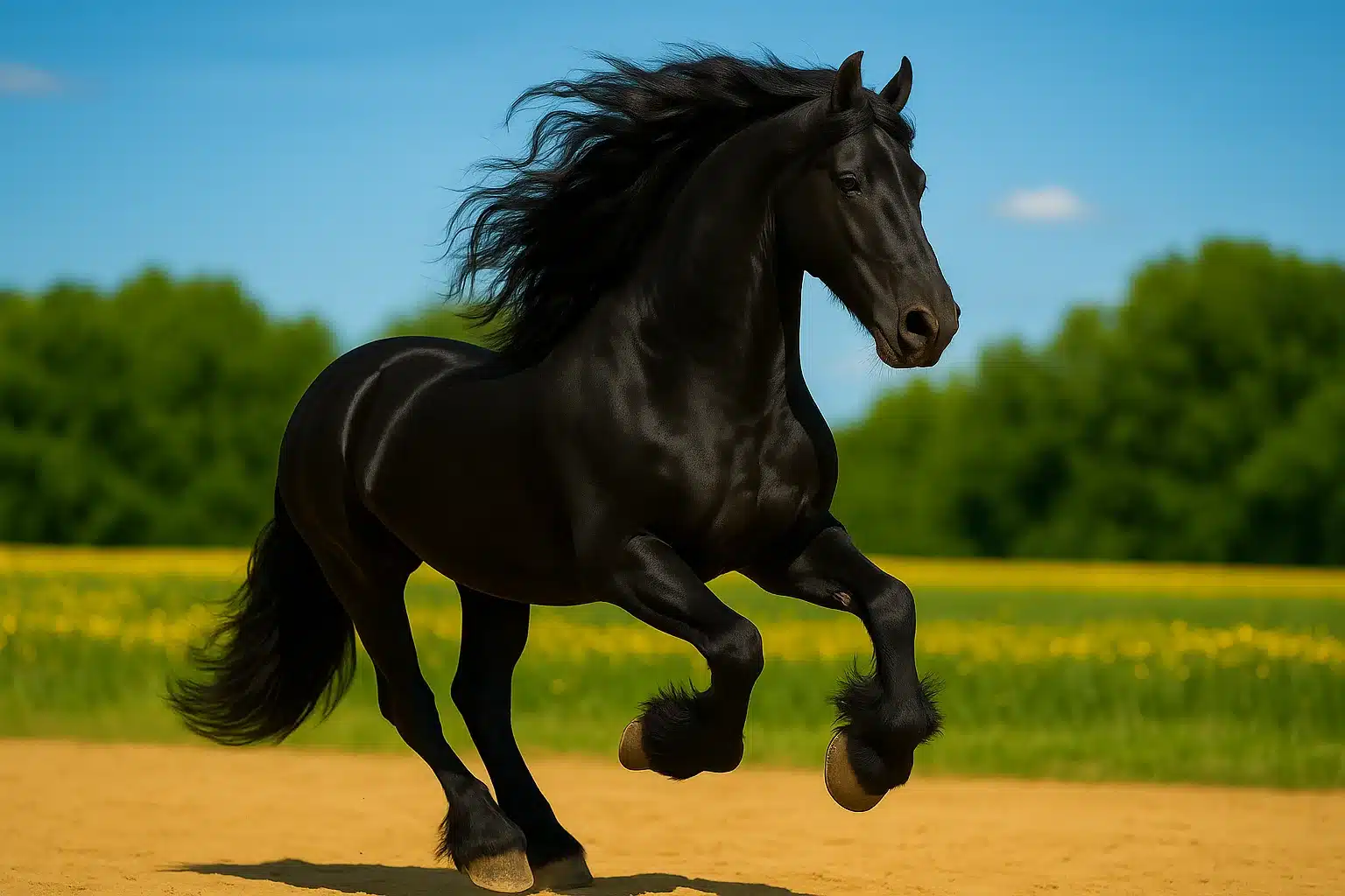 Poznaj konia fryzyjskiego – czarną legendę jeździectwa. Historia, wygląd, charakter i ciekawostki o jednej z najpiękniejszych ras na świecie.